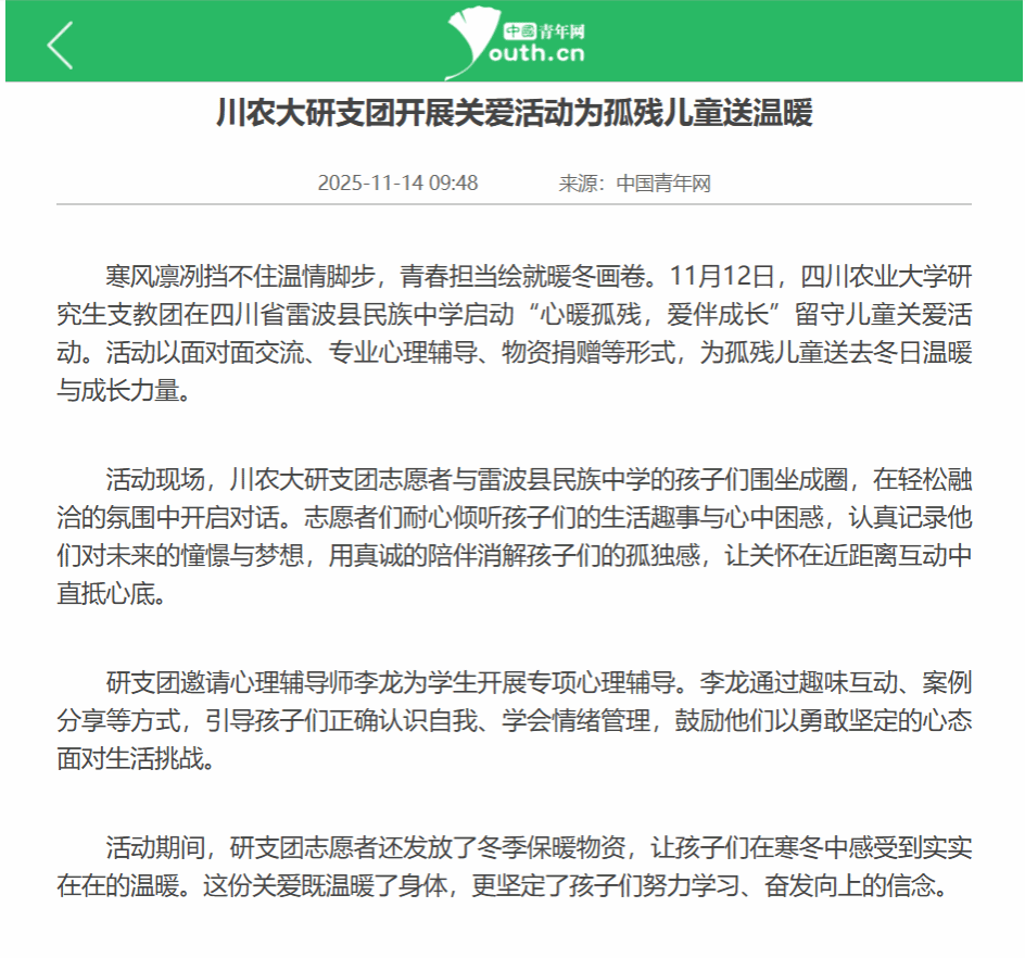 寒风凛冽挡不住温情脚步,青春担当绘就暖冬画卷。11月12日,四川农业大学研究生支教团在四川省雷波县民族中学启动“心暖孤残,爱伴成长”留守儿童关爱活动。活动以面对面交流、专业心理辅导、物资捐赠等形式,为孤残儿童送去冬日温暖与成长力量。