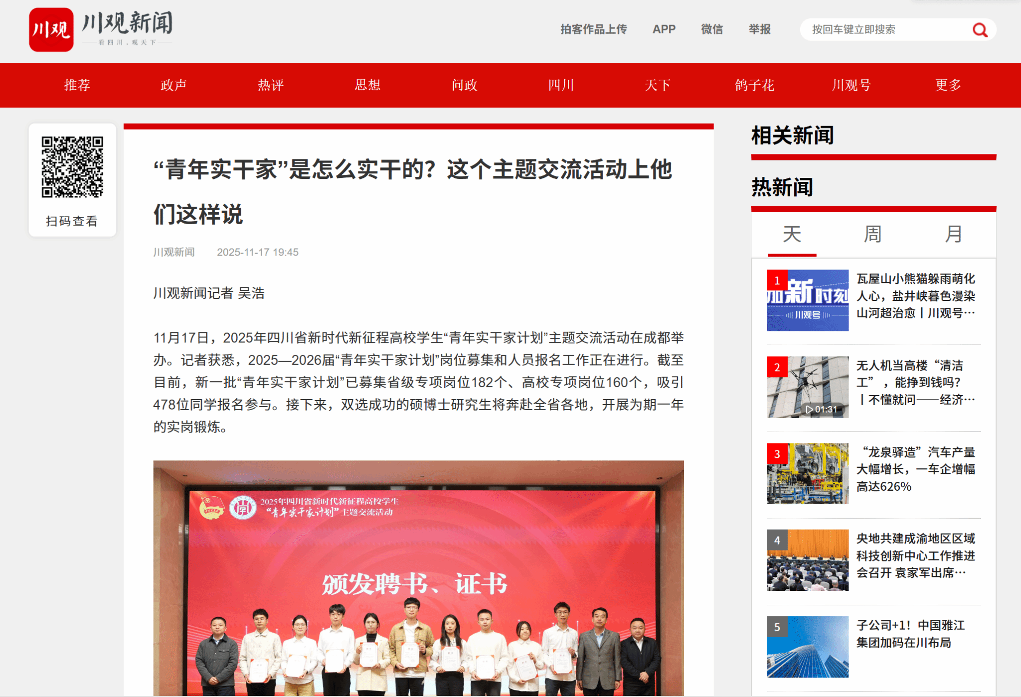 11月17日,2025年四川省新时代新征程高校学生“青年实干家计划”主题交流活动在成都举办。记者获悉,2025—2026届“青年实干家计划”岗位募集和人员报名工作正在进行。截至目前,新一批“青年实干家计划”已募集省级专项岗位182个、高校专项岗位160个,吸引478位同学报名参与。接下来,双选成功的硕博士研究生将奔赴全省各地,开展为期一年的实岗锻炼。