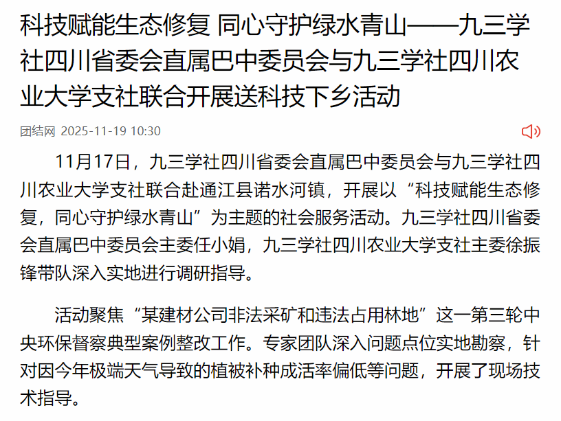 11月17日,九三学社四川省委会直属巴中委员会与九三学社四川农业大学支社联合赴通江县诺水河镇,开展以“科技赋能生态修复,同心守护绿水青山”为主题的社会服务活动。九三学社四川省委会直属巴中委员会主委任小娟,九三学社四川农业大学支社主委徐振锋带队深入实地进行调研指导。