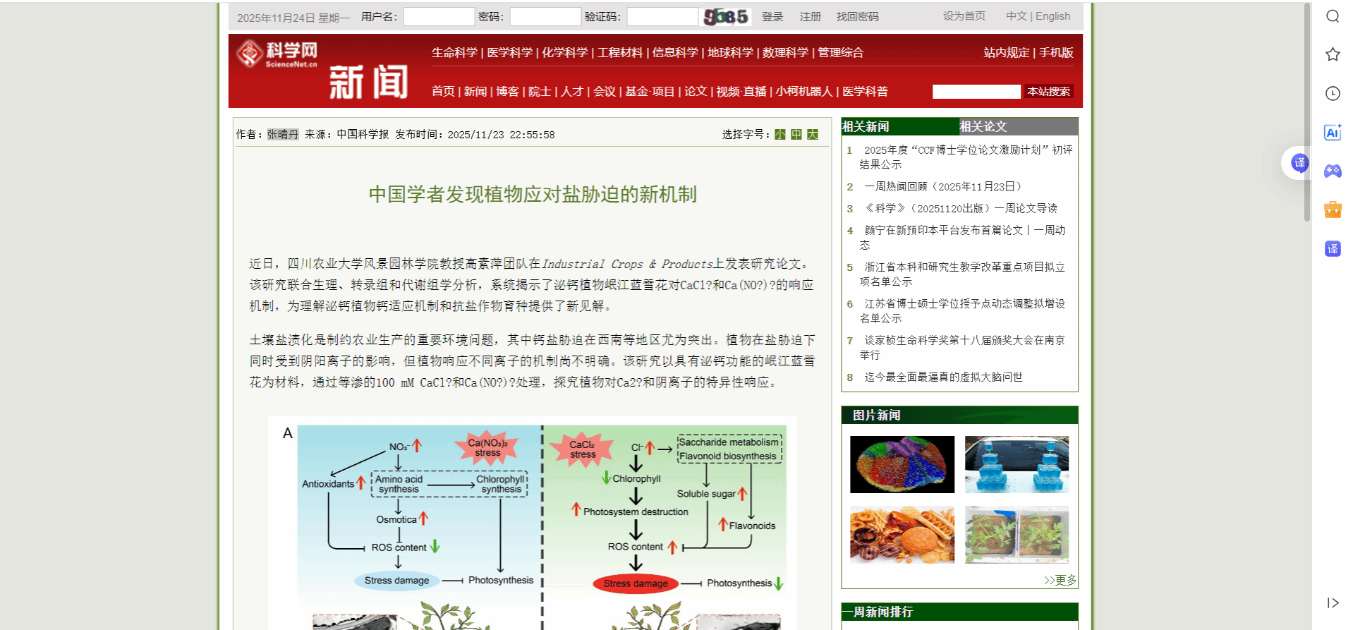 近日,四川农业大学风景园林学院教授高素萍团队在Industrial Crops & Products上发表研究论文。该研究联合生理、转录组和代谢组学分析,系统揭示了泌钙植物岷江蓝雪花对CaCl?和Ca(NO?)?的响应机制,为理解泌钙植物钙适应机制和抗盐作物育种提供了新见解。