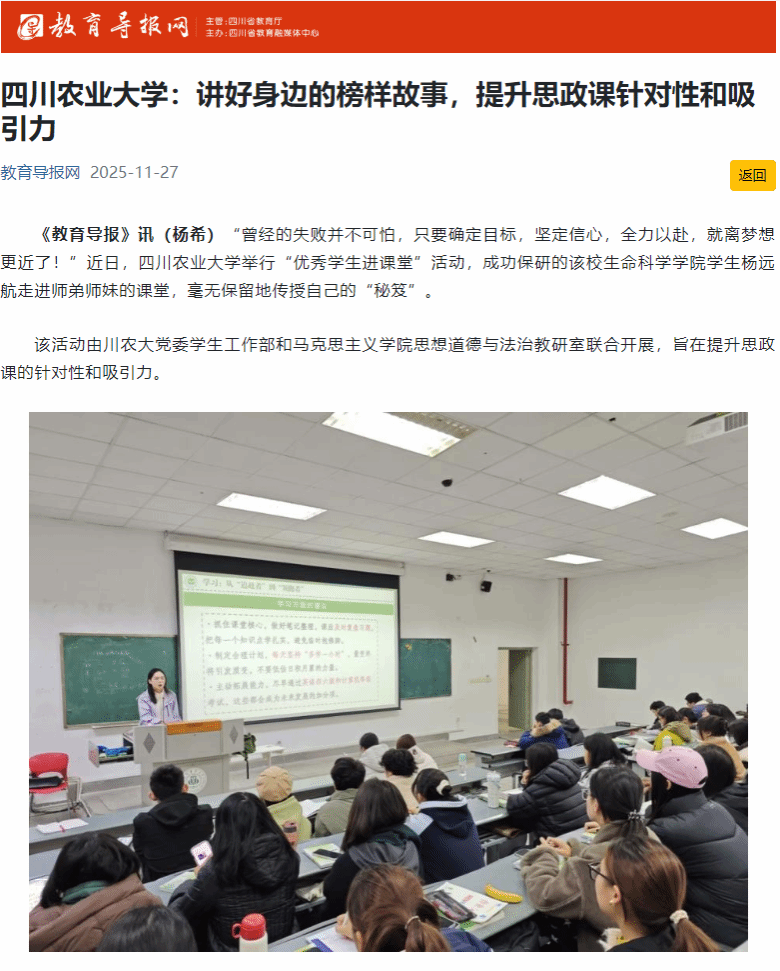如今,“优秀学生进课堂”活动已举办9届,身边榜样的成长故事感染影响着一代代新生。川农大思政课教师李晓辉说:“我们深入挖掘并展现那些源自平凡生活、贴近学生实际的榜样故事,让榜样不再遥不可及,学生们更容易听进去,也更能受到积极的影响,这就是朋辈教育的力量。”