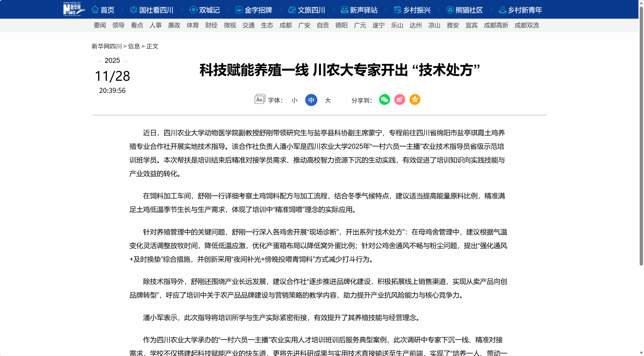 近日,四川农业大学动物医学院副教授舒刚带领研究生与盐亭县科协副主席蒙宁,专程前往四川省绵阳市盐亭琪霞土鸡养殖专业合作社开展实地技术指导。该合作社负责人潘小军是四川农业大学2025年“一村六员一主播”农业技术指导员省级示范培训班学员。本次帮扶是培训结束后精准对接学员需求、推动高校智力资源下沉的生动实践,有效促进了培训知识向实践技能与产业效益的转化。
