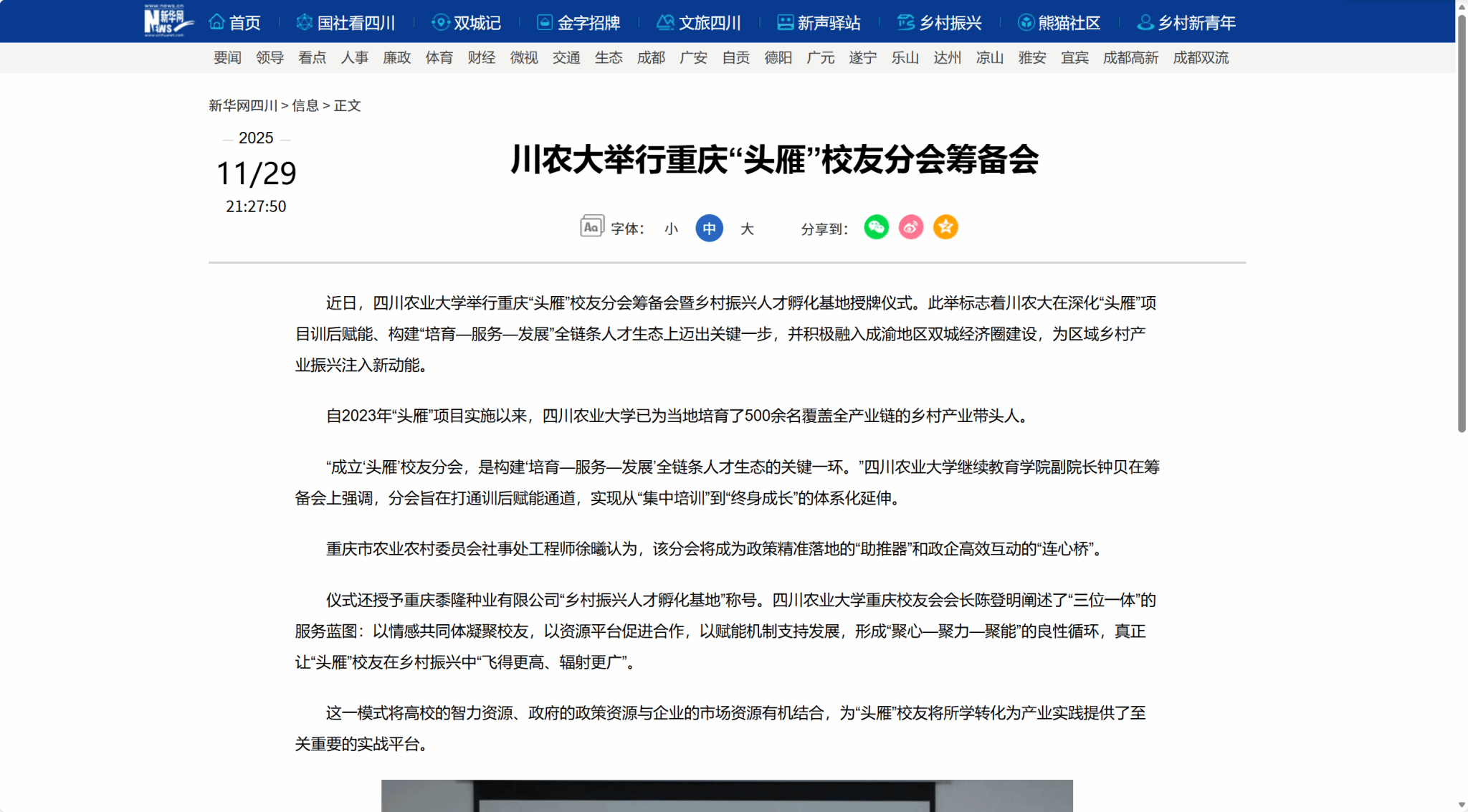 据悉,重庆“头雁”校友分会计划于2025年12月下旬正式成立。分会旨在推动人才、技术、资本等要素在成渝双城间高效流动,共同为成渝现代高效特色农业带建设贡献“川农力量”。