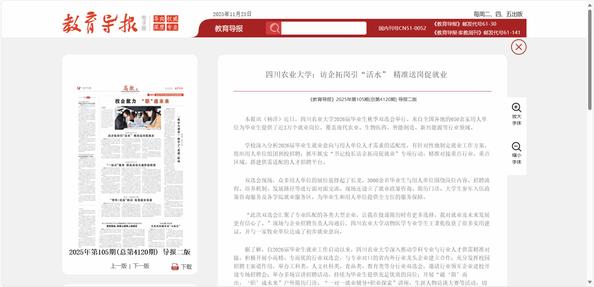 据了解,自2026届毕业生就业工作启动以来,四川农业大学深入推动学科专业与行业人才供需精准对接,积极开展小而精、专而优的行业双选会,与专业对口的省内外行业龙头企业建立合作;充分发挥校园招聘主渠道作用,举办工科类、人文社科类、食品类、教育类等分行业双选会,邀请行业领军企业进校开设专场招聘会;举办多场宣讲招聘活动,持续为毕业生提供充足优质的岗位;开展“破‘简’而出,‘职’成未来”户外简历门诊、“一对一就业辅导+职业探索”讲座、生涯人物访谈大赛等活动,切实增强毕业生求职获得感。