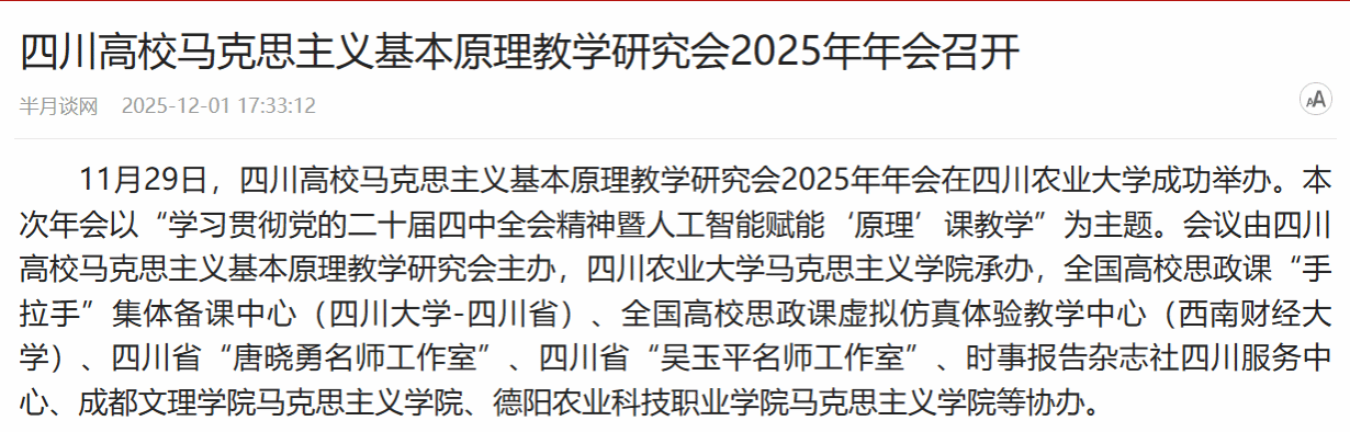 11月29日,四川高校马克思主义基本原理教学研究会2025年年会在四川农业大学成功举办。本次年会以“学习贯彻党的二十届四中全会精神暨人工智能赋能‘原理’课教学”为主题。会议由四川高校马克思主义基本原理教学研究会主办,四川农业大学马克思主义学院承办,全国高校思政课“手拉手”集体备课中心(四川大学-四川省)、全国高校思政课虚拟仿真体验教学中心(西南财经大学)、四川省“唐晓勇名师工作室”、四川省“吴玉平名师工作室”、时事报告杂志社四川服务中心、成都文理学院马克思主义学院、德阳农业科技职业学院马克思主义学院等协办。