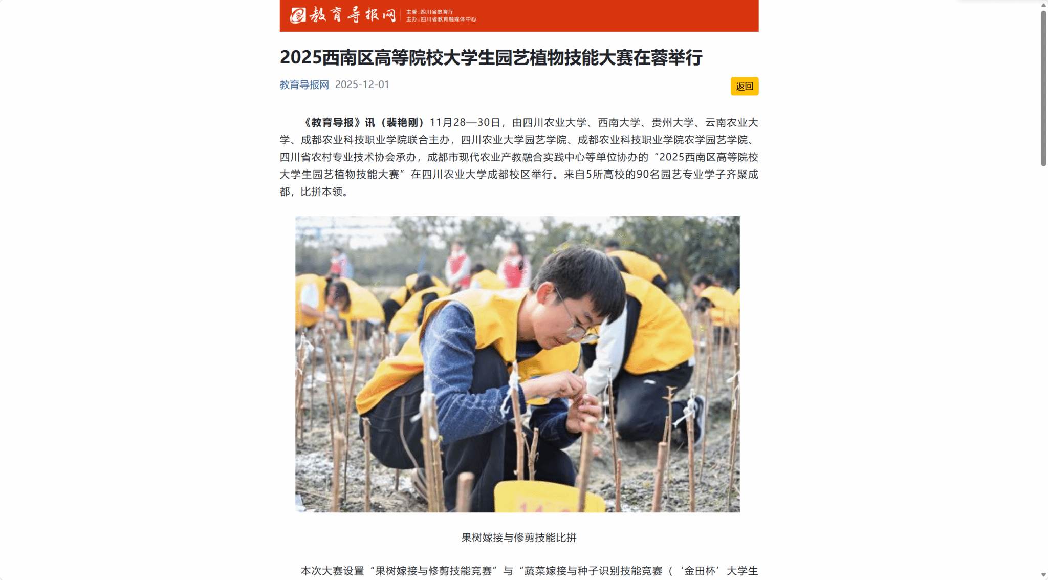 11月28—30日,由四川农业大学、西南大学、贵州大学、云南农业大学、成都农业科技职业学院联合主办,四川农业大学园艺学院、成都农业科技职业学院农学园艺学院、四川省农村专业技术协会承办,成都市现代农业产教融合实践中心等单位协办的“2025西南区高等院校大学生园艺植物技能大赛”在四川农业大学成都校区举行。来自5所高校的90名园艺专业学子齐聚成都,比拼本领。