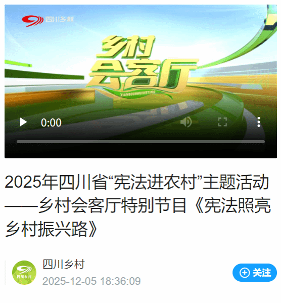 由四川省农业农村厅、司法厅主办的2025年“宪法进农村”主题活动,与乡亲们相约北川羌族自治县石椅羌寨,共同呈现乡村会客厅特别节目——《宪法照亮乡村振兴路》。本次活动旨在学习宣传贯彻习近平法治思想,推动宪法法律深入人心,为加快农业农村现代化营造良好法治环境,让法治之光温暖乡村、照亮振兴之路。
