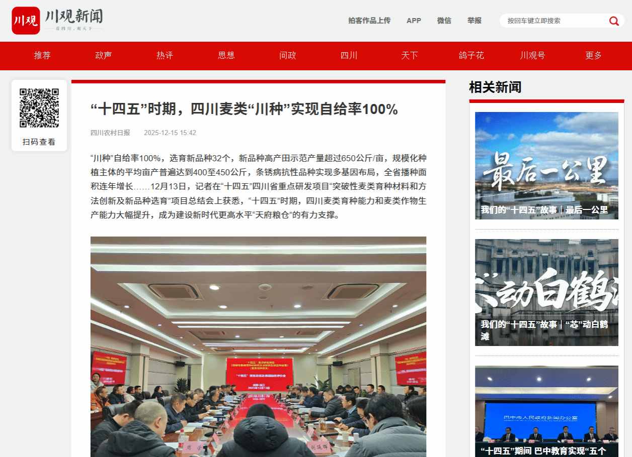 “川种”自给率100%,选育新品种32个,新品种高产田示范产量超过650公斤/亩,规模化种植主体的平均亩产普遍达到400至450公斤,条锈病抗性品种实现多基因布局,全省播种面积连年增长……12月13日,记者在“十四五”四川省重点研发项目“突破性麦类育种材料和方法创新及新品种选育”项目总结会上获悉,“十四五”时期,四川麦类育种能力和麦类作物生产能力大幅提升,成为建设新时代更高水平“天府粮仓”的有力支撑。