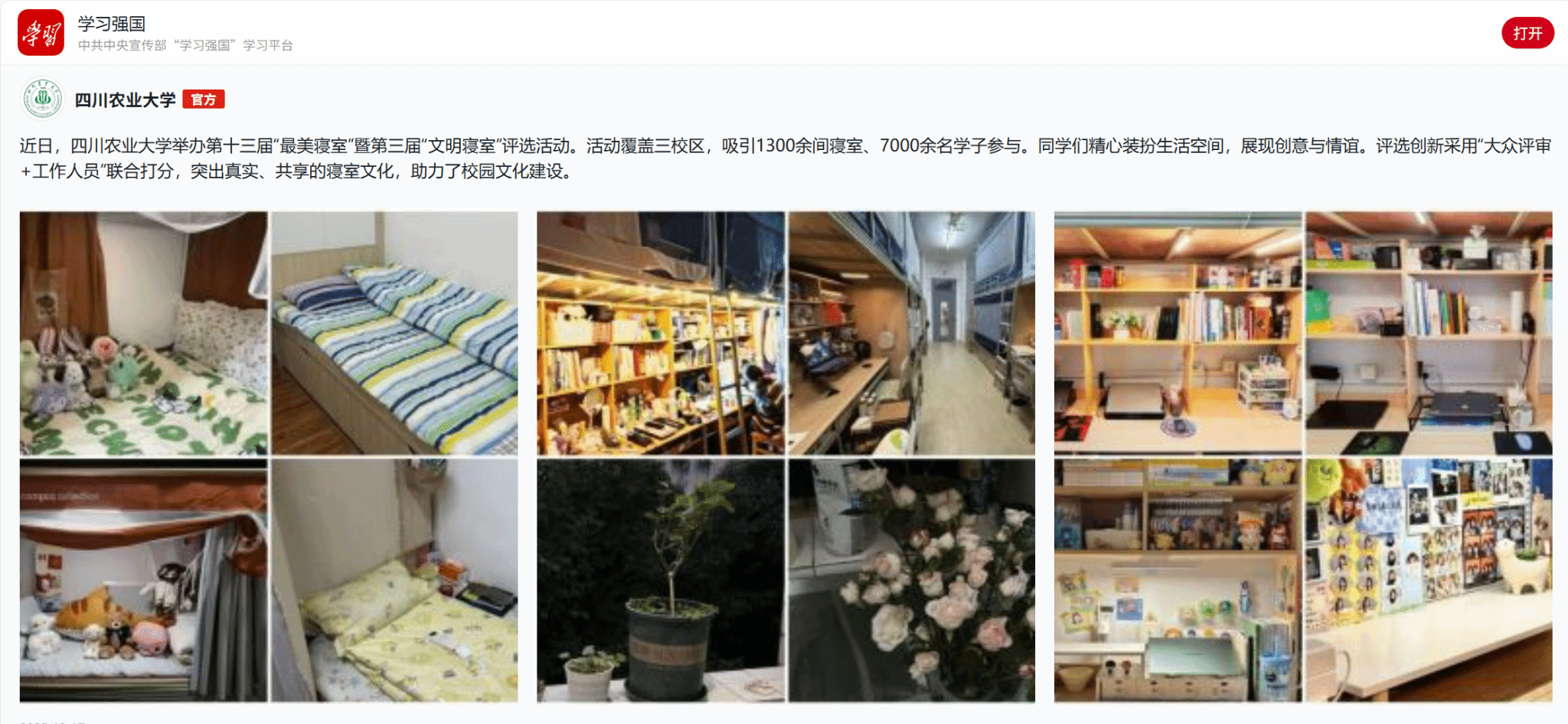 近日,四川农业大学举办第十三届“最美寝室”暨第三届“文明寝室”评选活动。活动覆盖三校区,吸引1300余间寝室、7000余名学子参与。同学们精心装扮生活空间,展现创意与情谊。评选创新采用“大众评审+工作人员”联合打分,突出真实、共享的寝室文化,助力了校园文化建设。