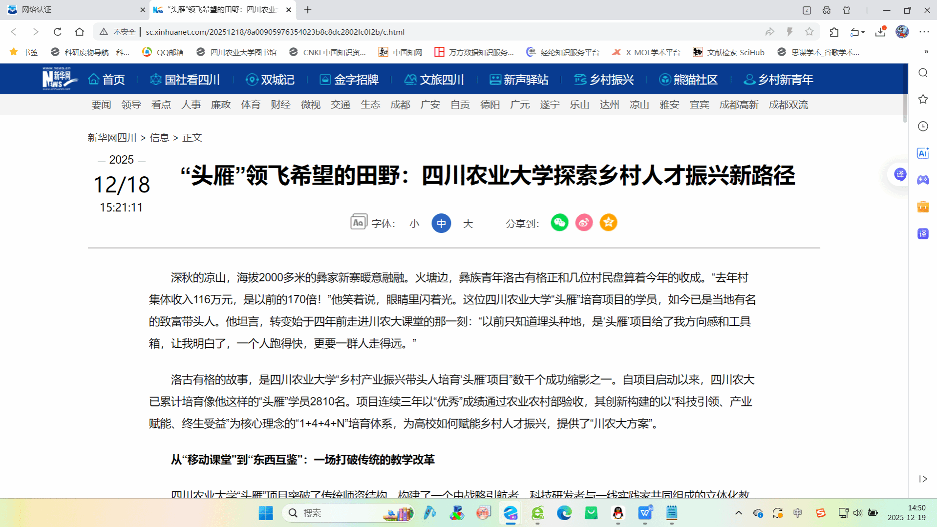 四川农业大学党委书记刘登才表示:“服务乡村振兴是高等农业院校的时代使命。”从跨越山海的视野开拓,到全程陪伴的生态支撑,再到深耕产业的扎实成效,川农大正通过“头雁”项目,探索一条人才振兴引领产业振兴的有效路径。在这里,一只只“头雁”被赋能、被连接、被托举,越来越多的乡村振兴带头人正振翅高飞,带领着他们的“雁阵”,飞向共同富裕的明天。