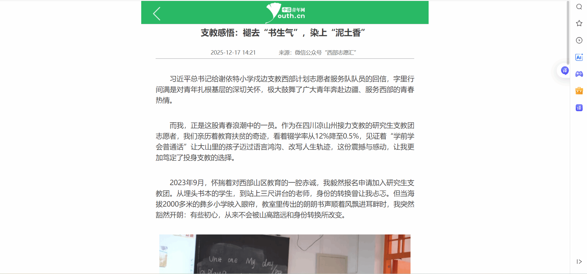 习近平总书记给谢依特小学戍边支教西部计划志愿者服务队队员的回信,字里行间满是对青年扎根基层的深切关怀,极大鼓舞了广大青年奔赴边疆、服务西部的青春热情。