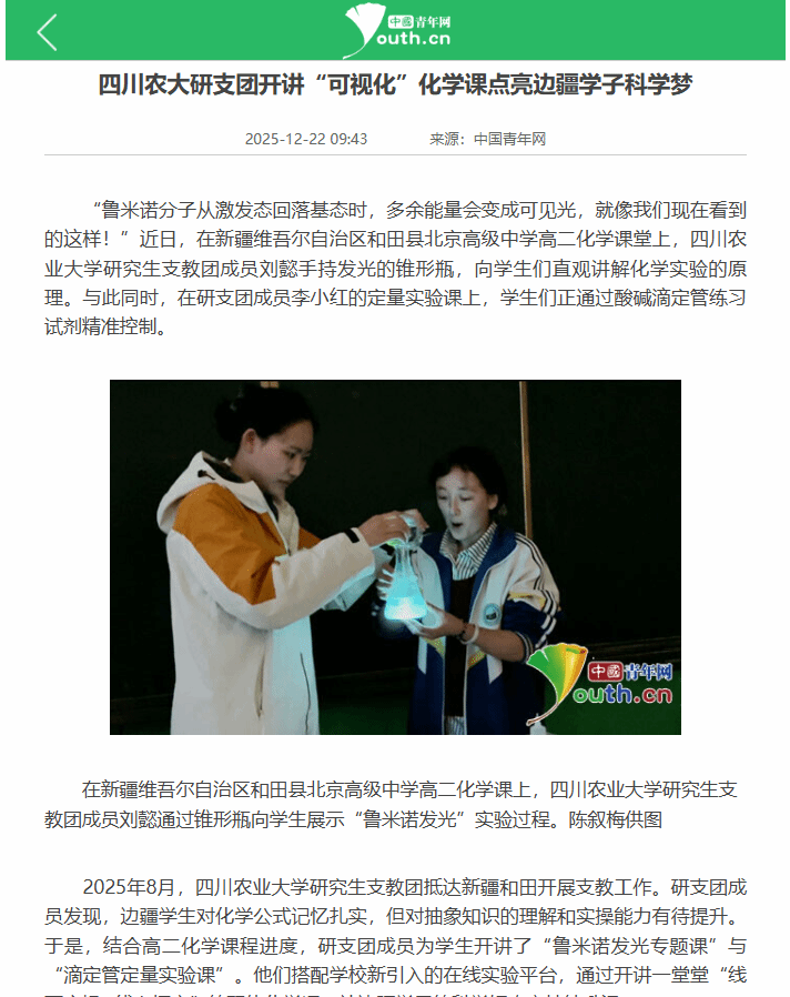 2025年8月,四川农业大学研究生支教团抵达新疆和田开展支教工作。研支团成员发现,边疆学生对化学公式记忆扎实,但对抽象知识的理解和实操能力有待提升。于是,结合高二化学课程进度,研支团成员为学生开讲了“鲁米诺发光专题课”与“滴定管定量实验课”。他们搭配学校新引入的在线实验平台,通过开讲一堂堂“线下实操+线上探究”的双轨化学课,让边疆学子的科学好奇心持续升温。