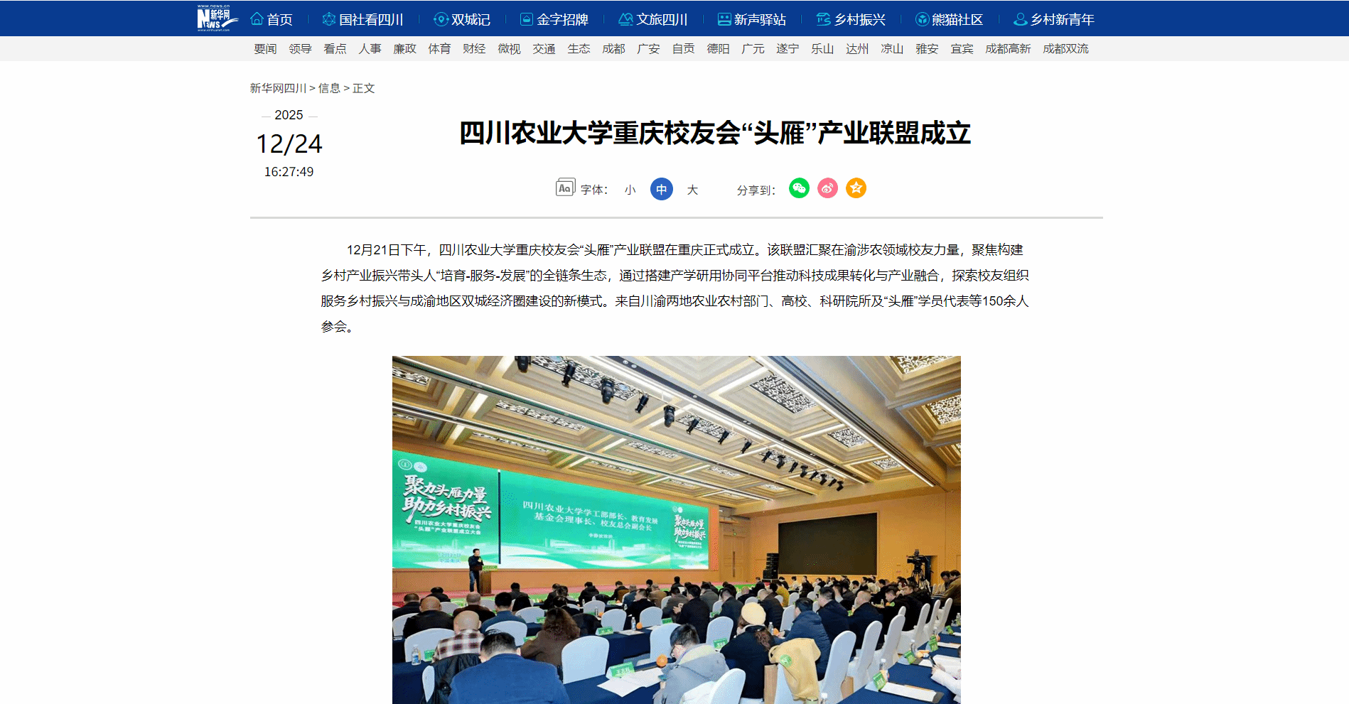 12月21日下午,四川农业大学重庆校友会“头雁”产业联盟在重庆正式成立。该联盟汇聚在渝涉农领域校友力量,聚焦构建乡村产业振兴带头人“培育-服务-发展”的全链条生态,通过搭建产学研用协同平台推动科技成果转化与产业融合,探索校友组织服务乡村振兴与成渝地区双城经济圈建设的新模式。来自川渝两地农业农村部门、高校、科研院所及“头雁”学员代表等150余人参会。