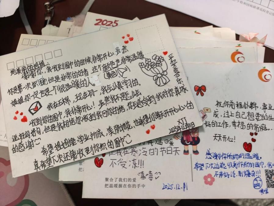 每条围巾都随附两张明信片,一张写满真挚祝福,一张留白静待回信。卡片之上,质朴心意流淌:有人写道“织围巾时总在想,你围着它走在寒风里,风便吹不进领口了”;有人手绘卡通小动物,配文“愿你健健康康、慢慢长大,找到自己的热爱,自信拥抱这个世界”;更有热情邀约“等你长大,欢迎来川农大做客”。