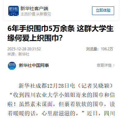 绵长情谊,生生不息。今年冬天,承载着川农大学学生心意的14676条手织围巾,跨越山川湖海,奔赴各地有需要的人身边——在新疆的课堂上,在凉山的校舍里,在内江的养老院内,一双双稚嫩或苍老的手,接过这份冬日暖意。