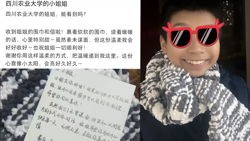 近日,四川省内江市第二小学校一名六年级男生将收到的冬日礼物——一条手织围巾和一张手写卡片的照片分享在社交平台,戴着灰白条纹围巾的男孩脸上露出开心的笑容,获得众多网友点赞。