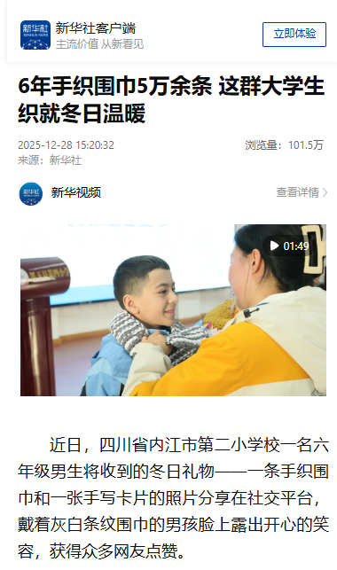 自2020年启动该活动以来,四川农业大学学生累计为四川、新疆、河北等地偏远乡镇、高原山区的中小学校,寄出手织围巾超过5万条。