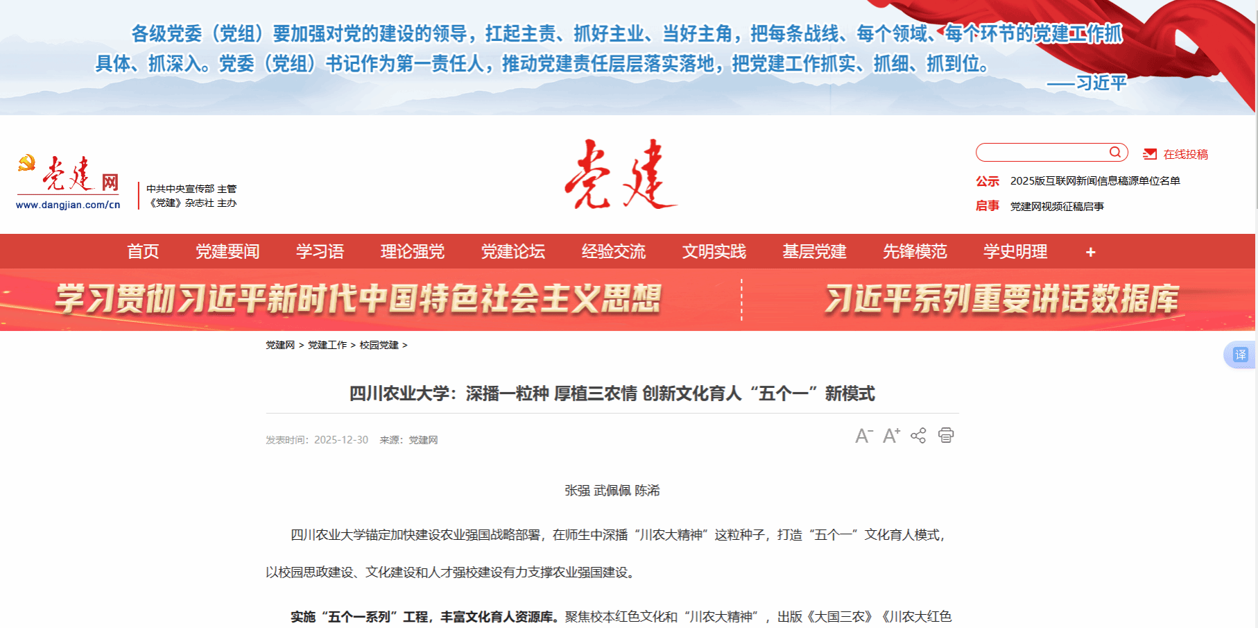2026年是四川农业大学120周年校庆。学校将以此为契机,持续深化“五个一”文化育人模式创新,让“川农大精神”这粒种子在更多青年心中生根发芽,为农业强国建设培育更多知农爱农、强农兴农的时代新人。