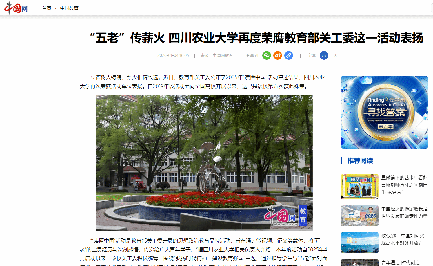 立德树人铸魂,薪火相传致远。近日,教育部关工委公布了2025年“读懂中国”活动评选结果,四川农业大学再次荣获活动单位表扬。自2019年该活动面向全国高校开展以来,这已是该校第五次获此殊荣。