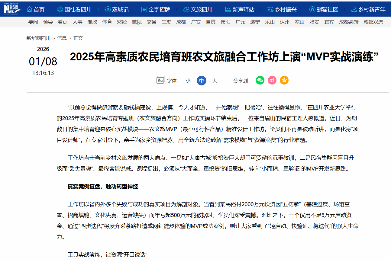 “以前总觉得做旅游就要砸钱搞建设、上规模,今天才知道,一开始就想‘一把梭哈’,往往输得最惨。”在四川农业大学举行的2025年高素质农民培育专题班(农文旅融合方向)工作坊实操环节结束后,一位来自眉山的民宿主理人感慨道。近日,为期数日的集中培育迎来核心实战模块——农文旅MVP(最小可行性产品)精准设计工作坊。学员们不再是被动听讲,而是化身“项目设计师”,在专家引导下,亲手为家乡资源把脉,用全新方法论破解“需求模糊”与“资源浪费”的行业难题。