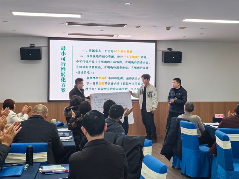 最具挑战也最富成效的环节,是每组需为优选的核心资源,设计一份“最小可行性转化方案”。方案必须明确回答:目标客群是谁?首期只做哪三件事?定价多少?如何收集验证数据?90天内分几步走?“我们不做大拆大建,就做一场‘稻田里的亲子丰收节’,用最低成本测试市场反应。”学员们围绕明确的目标,激烈讨论,摒弃空想,聚焦可执行、可验证的微小起点。一份份充满巧思的“90天启动蓝图”在碰撞中逐渐清晰。