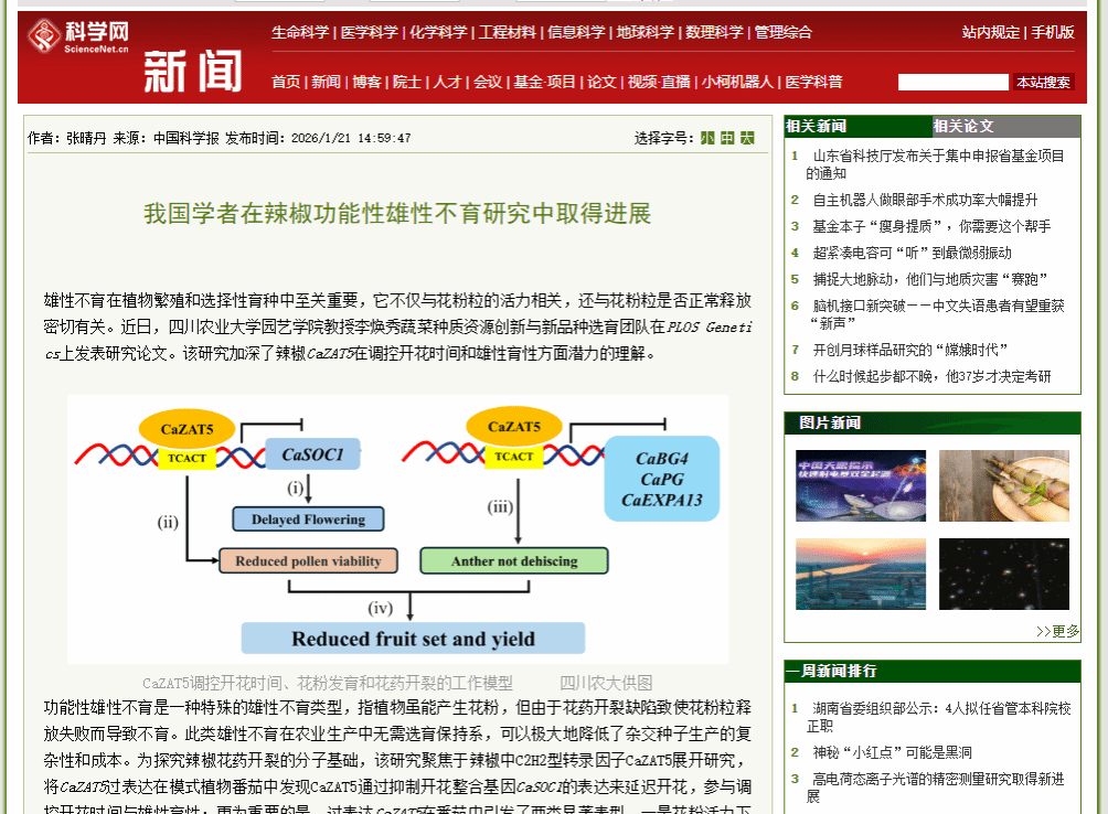 雄性不育在植物繁殖和选择性育种中至关重要,它不仅与花粉粒的活力相关,还与花粉粒是否正常释放密切有关。近日,四川农业大学园艺学院教授李焕秀蔬菜种质资源创新与新品种选育团队在PLOS Genetics上发表研究论文。该研究加深了辣椒CaZAT5在调控开花时间和雄性育性方面潜力的理解。