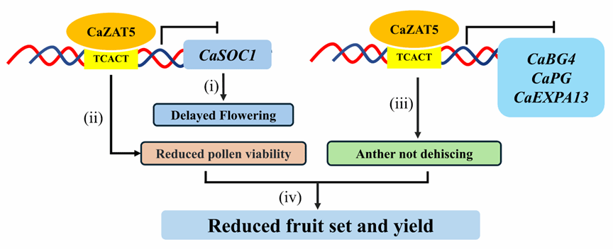 CaZAT5调控开花时间、花粉发育和花药开裂的工作模型 四川农大供图