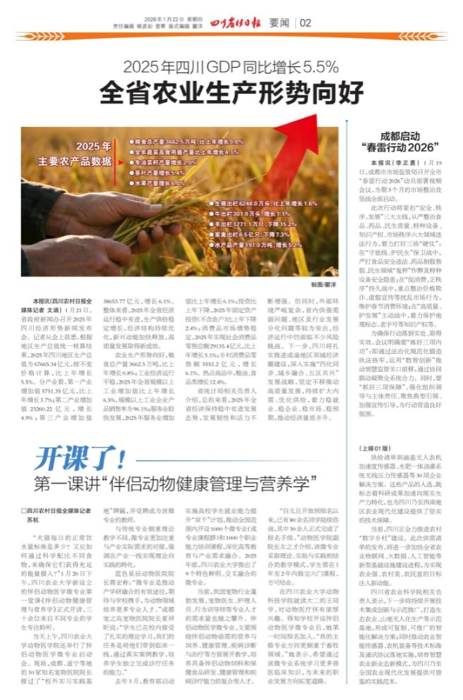 “犬猫每日的正常饮水量标准是多少?又应如何通过科学配比不同食物,来确保它们获得充足的能量摄入?”1月20日下午,四川农业大学新设立的伴侣动物医学微专业第一堂课《伴侣动物健康管理与营养学》正式开讲,三十余位来自不同专业的学生专注聆听。