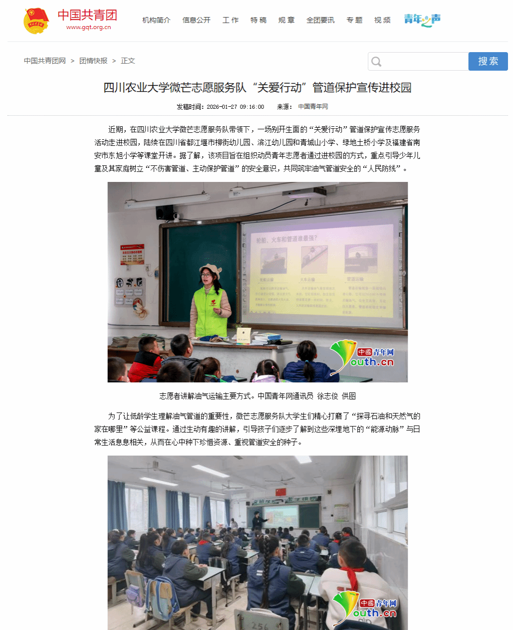 近期,在四川农业大学微芒志愿服务队带领下,一场别开生面的“关爱行动”管道保护宣传志愿服务活动走进校园,陆续在四川省都江堰市柳街幼儿园、滨江幼儿园和青城山小学、绿地土桥小学及福建省南安市东旭小学等课堂开讲。据了解,该项目旨在组织动员青年志愿者通过进校园的方式,重点引导少年儿童及其家庭树立“不伤害管道、主动保护管道”的安全意识,共同筑牢油气管道安全的“人民防线”。