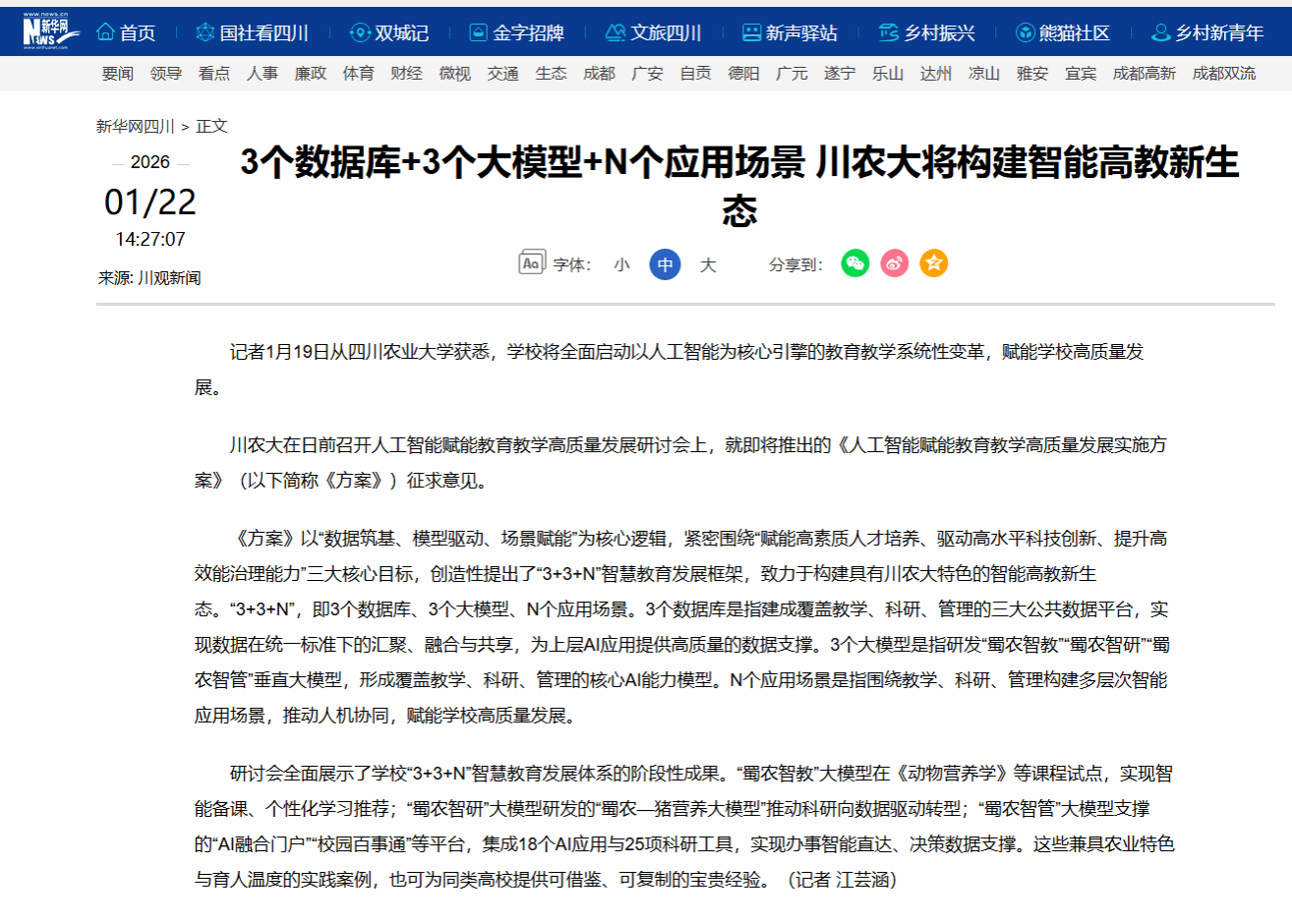记者1月19日从四川农业大学获悉,学校将全面启动以人工智能为核心引擎的教育教学系统性变革,赋能学校高质量发展。