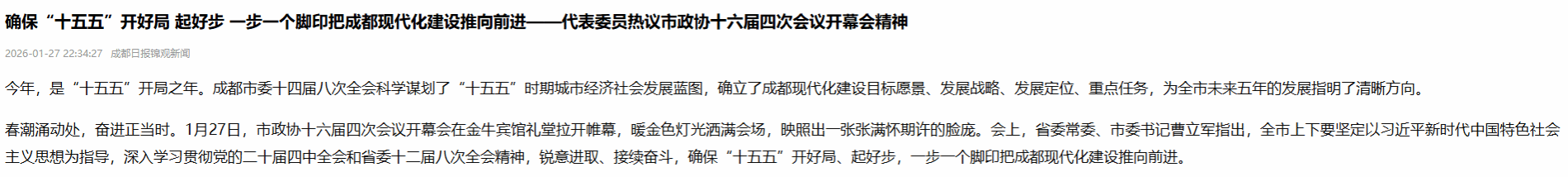 今年,是“十五五”开局之年。成都市委十四届八次全会科学谋划了“十五五”时期城市经济社会发展蓝图,确立了成都现代化建设目标愿景、发展战略、发展定位、重点任务,为全市未来五年的发展指明了清晰方向。