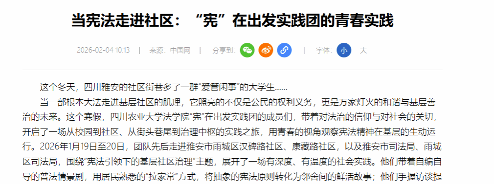 当一部根本大法走进基层社区的肌理,它照亮的不仅是公民的权利义务,更是万家灯火的和谐与基层善治的未来。这个寒假,四川农业大学法学院“宪”在出发实践团的成员们,带着对法治的信仰与对社会的关切,开启了一场从校园到社区、从街头巷尾到治理中枢的实践之旅,用青春的视角观察宪法精神在基层的生动运行。2026年1月19日至20日,团队先后走进雅安市雨城区汉碑路社区、康藏路社区,以及雅安市司法局、雨城区司法局,围绕“宪法引领下的基层社区治理”主题,展开了一场有深度、有温度的社会实践。他们带着自编自导的普法情景剧,用居民熟悉的“拉家常”方式,将抽象的宪法原则转化为邻舍间的鲜活故事;他们手握访谈提纲,在社区广场、司法局会议室里,记录下治理一线最真实的探索与思考。