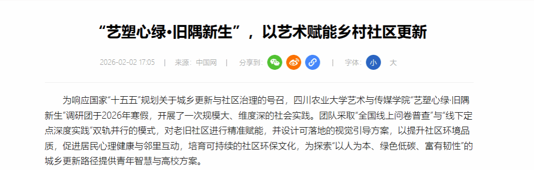 为响应国家“十五五”规划关于城乡更新与社区治理的号召,四川农业大学艺术与传媒学院“艺塑心绿·旧隅新生”调研团于2026年寒假,开展了一次规模大、维度深的社会实践。团队采取“全国线上问卷普查”与“线下定点深度实践”双轨并行的模式,对老旧社区进行精准赋能,并设计可落地的视觉引导方案,以提升社区环境品质,促进居民心理健康与邻里互动,培育可持续的社区环保文化,为探索“以人为本、绿色低碳、富有韧性”的城乡更新路径提供青年智慧与高校方案。