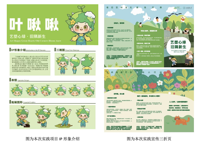 基于调研,团队为项目设计了统一的IP形象“叶啾啾”,并为其衍生出各种生动表情、手持农具的特色形象,亲切可爱,易于传播。针对两村的不同需求,团队分别设计了AR互动海报,并且为两村量身定制的环保三折页,内容贴合当地实际,成为实用的宣传工具。