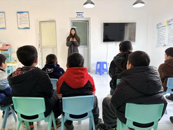 图为团队成员在活动室为孩子们讲解知识