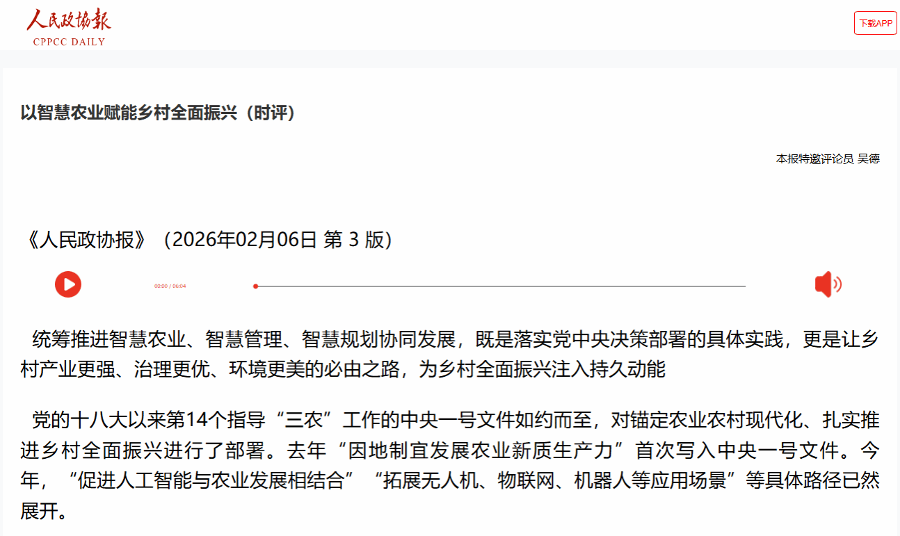 中央农村工作会议强调要“锚定农业农村现代化,扎实推进乡村全面振兴,推动城乡融合发展”。当前,新一代信息技术作为农业新质生产力的重要载体,正与农业生产、乡村治理、空间规划等多领域加速融合。统筹推进智慧农业、智慧管理、智慧规划协同发展,既是落实党中央决策部署的具体实践,更是让乡村产业更强、治理更优、环境更美的必由之路,为乡村全面振兴注入持久动能。