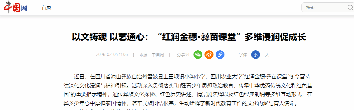 四川农业大学“红润金穗·彝苗课堂”冬令营活动,通过多维度、沉浸式的支教课程设计,将新时代对青少年成长成才的殷切期望落细落实。活动有效促进了民族文化交融互鉴,创新推动了红色基因的现代表达与传承,是高校服务乡村振兴、落实立德树人根本任务,培养担当民族复兴大任时代新人的又一次生动实践。在这片希望的田野上,民族团结与爱国主义的种子正在蓬勃生长,必将汇聚成实现中华民族伟大复兴的青春力量。