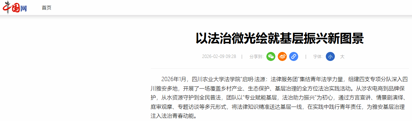 2026年1月,四川农业大学法学院“启明·法源:法律服务团”集结青年法学力量,组建四支专项分队深入四川雅安多地,开展了一场覆盖乡村产业、生态保护、基层治理的全方位法治实践活动。从涉农电商到品牌保护,从水资源守护到全民普法,团队以“专业赋能基层,法治助力振兴”为初心,通过方言宣讲、情景剧演绎、庭审观摩、专题访谈等多元形式,将法律知识精准送达基层一线,在实践中践行青年责任,为雅安基层治理注入法治青春动能。
