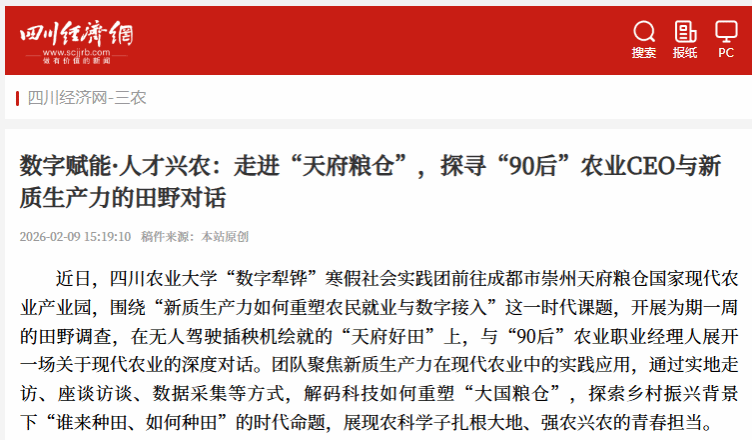 近日,四川农业大学“数字犁铧”寒假社会实践团前往成都市崇州天府粮仓国家现代农业产业园,围绕“新质生产力如何重塑农民就业与数字接入”这一时代课题,开展为期一周的田野调查,在无人驾驶插秧机绘就的“天府好田”上,与“90后”农业职业经理人展开一场关于现代农业的深度对话。团队聚焦新质生产力在现代农业中的实践应用,通过实地走访、座谈访谈、数据采集等方式,解码科技如何重塑“大国粮仓”,探索乡村振兴背景下“谁来种田、如何种田”的时代命题,展现农科学子扎根大地、强农兴农的青春担当。