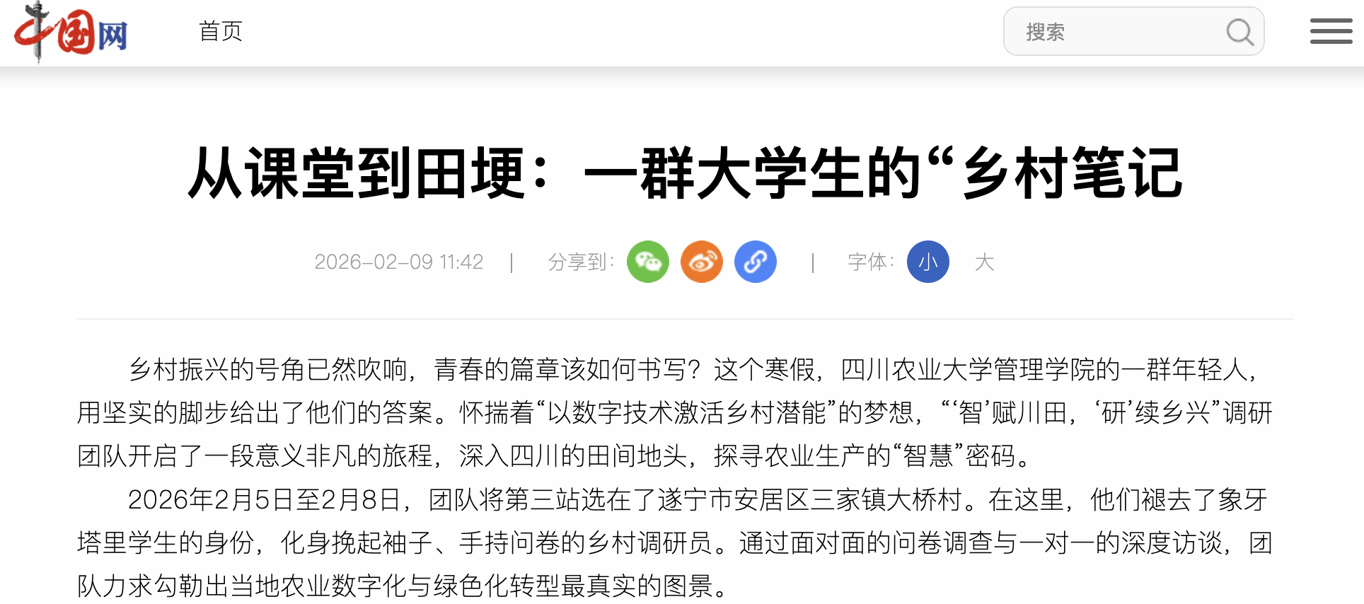 乡村振兴的号角已然吹响,青春的篇章该如何书写?这个寒假,四川农业大学管理学院的一群年轻人,用坚实的脚步给出了他们的答案。怀揣着“以数字技术激活乡村潜能”的梦想,“‘智’赋川田,‘研’续乡兴”调研团队开启了一段意义非凡的旅程,深入四川的田间地头,探寻农业生产的“智慧”密码。