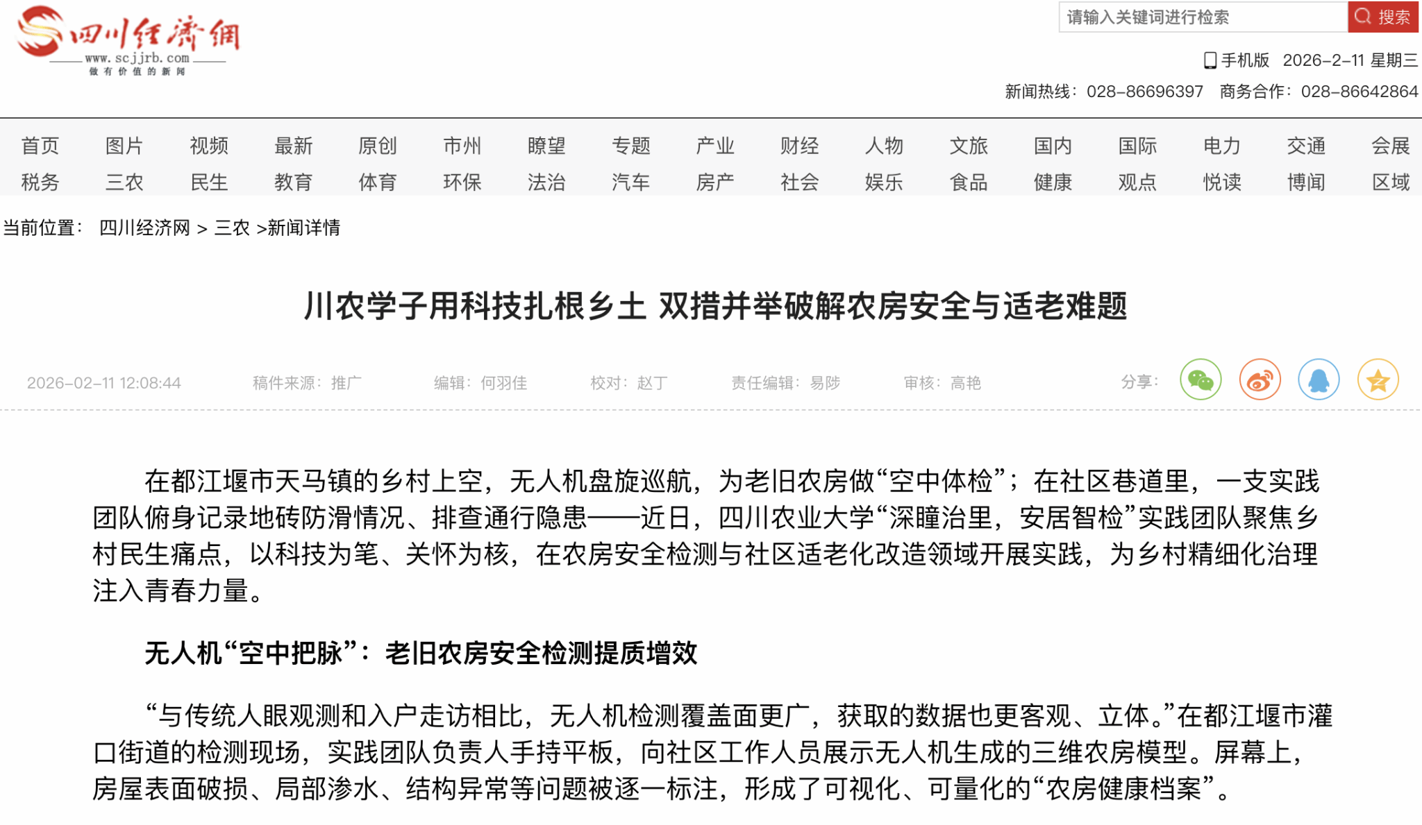 在都江堰市天马镇的乡村上空,无人机盘旋巡航,为老旧农房做“空中体检”;在社区巷道里,一支实践团队俯身记录地砖防滑情况、排查通行隐患——近日,四川农业大学“深瞳治里,安居智检”实践团队聚焦乡村民生痛点,以科技为笔、关怀为核,在农房安全检测与社区适老化改造领域开展实践,为乡村精细化治理注入青春力量。