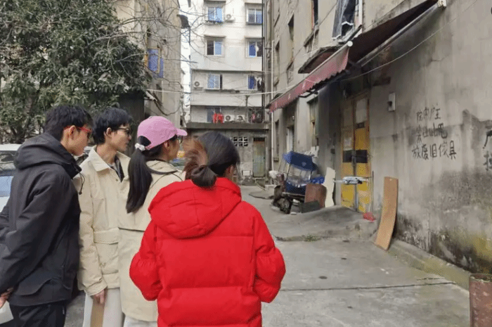 实践团队成员在老旧平房区开展调研,近距离查看墙体老化情况