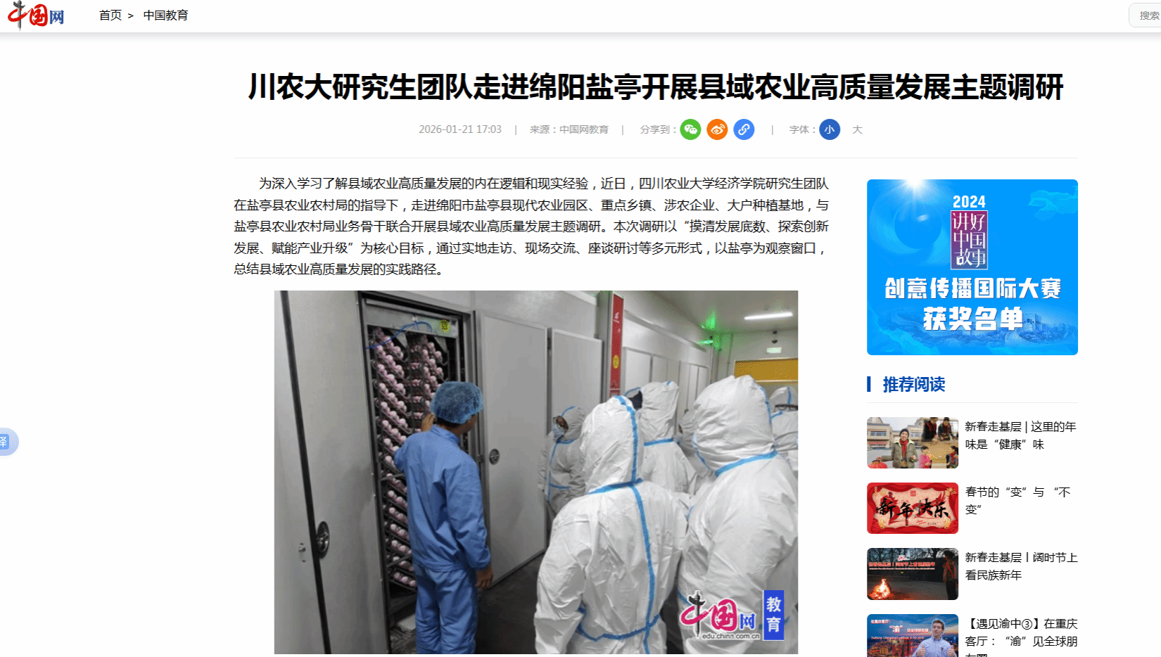 充实的实地调研让川农大研究生团队收获颇丰。团队成员潘倬说道:“‘十五五’规划提出要统筹发展科技农业、绿色农业、质量农业、品牌农业,把农业建成现代化大产业。县域是农业农村现代化的‘最后一公里’,盐亭的实践让我真切看到了县域统筹发展科技农业、绿色农业、质量农业、品牌农业的高标准范式,也让我对理论知识如何服务地方农业经济发展有了更深刻的理解。”