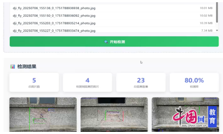 检测数据的价值在于分析。实践团基于YOLOv8与YOLOv11双模型,自主搭建建筑病害智能识别系统。经多源图像训练,系统可自动识别外墙裂缝、饰面剥落、护栏松动、屋面渗漏等8类常见病害,并依据面积、位置、结构关联性进行严重程度分级,识别效率较人工提升70%以上。