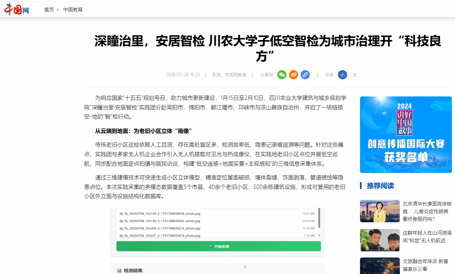 “此次寒假社会实践,实践团以实际行动践行了‘受教育、长才干、作贡献’的育人目标,走出校园、扎根社区,将低空遥感与人工智能技术应用于城市更新一线,在技术攻关中锤炼专业本领,在基层服务中传递科技温度。”四川农业大学相关负责人表示,该团队不仅为老旧小区治理提供了可复制的“智检”方案,也推动了数字技术与民生服务的深度融合,为基层治理现代化注入了青春动能。未来,团队将持续聚焦城市更新与适老化建设需求,以专业之力赋能宜居城市建设,让科技创新真正惠及千家万户。
