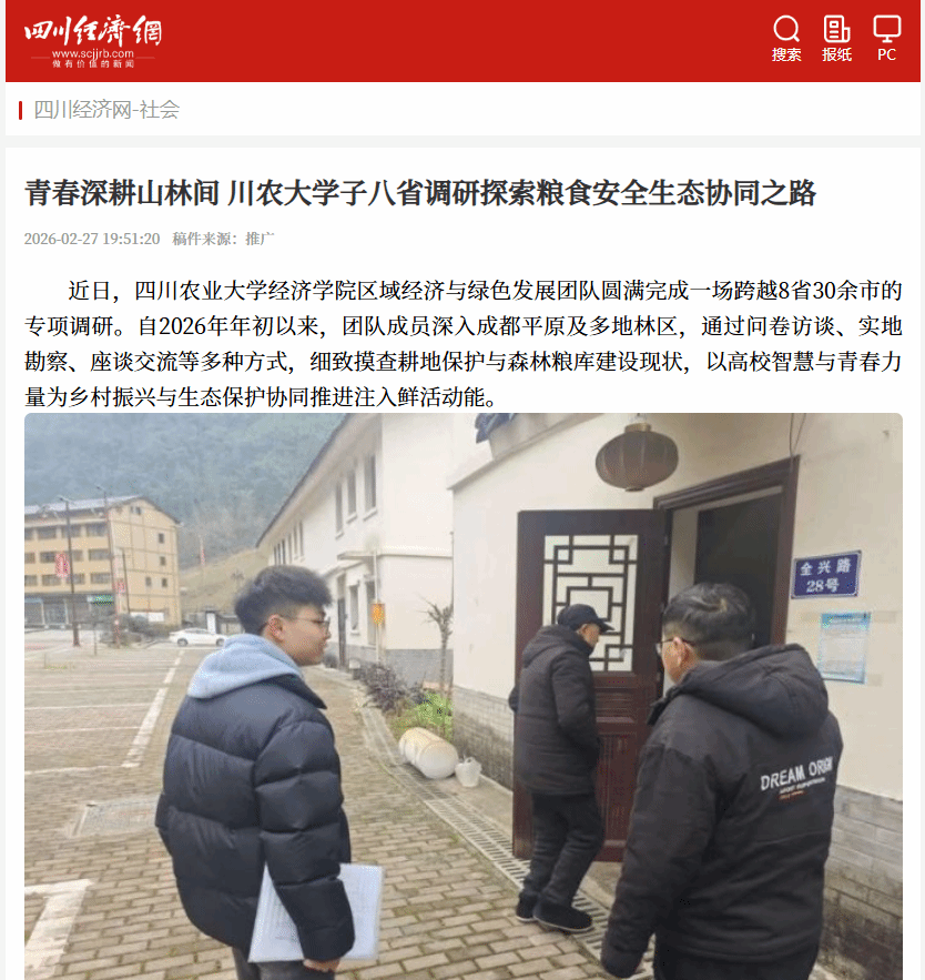 近日,四川农业大学经济学院区域经济与绿色发展团队圆满完成一场跨越8省30余市的专项调研。自2026年年初以来,团队成员深入成都平原及多地林区,通过问卷访谈、实地勘察、座谈交流等多种方式,细致摸查耕地保护与森林粮库建设现状,以高校智慧与青春力量为乡村振兴与生态保护协同推进注入鲜活动能。