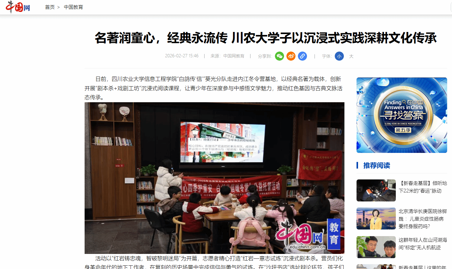 “此次实践摒弃传统灌输式教学,以沉浸式体验搭建起名著与童心的桥梁,让红色经典与古典文学焕发新时代生机。”四川农业大学信息工程学院相关负责人表示,学院将持续指导实践团队发挥特色,以创新形式助力文化传承,激励青少年成长为有信仰、有力量、有温度的新时代文化传承者与传播者。