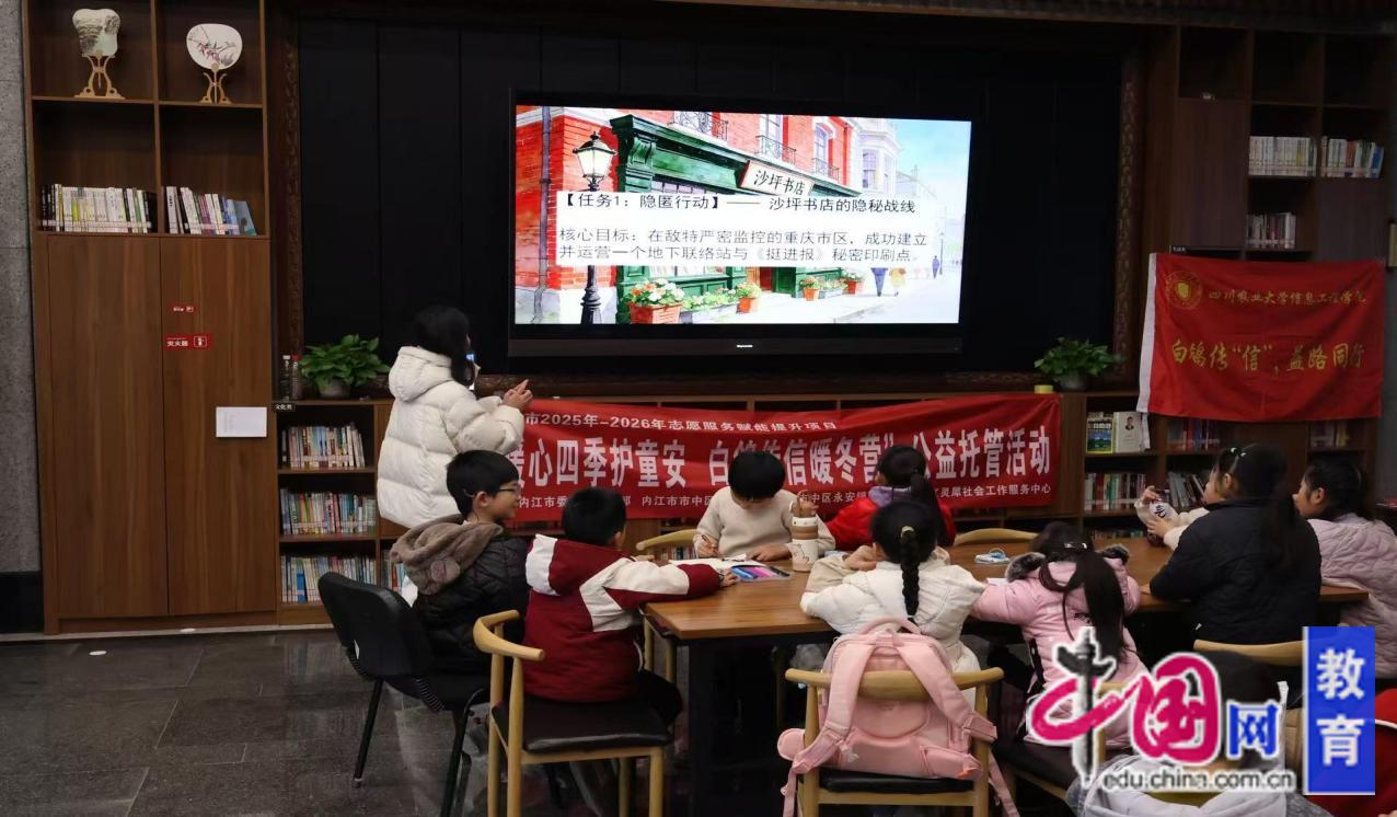 日前,四川农业大学信息工程学院“白鸽传‘信’”葵光分队走进内江冬令营基地,以经典名著为载体,创新开展“剧本杀+戏剧工坊”沉浸式阅读课程,让青少年在深度参与中感悟文学魅力,推动红色基因与古典文脉活态传承。