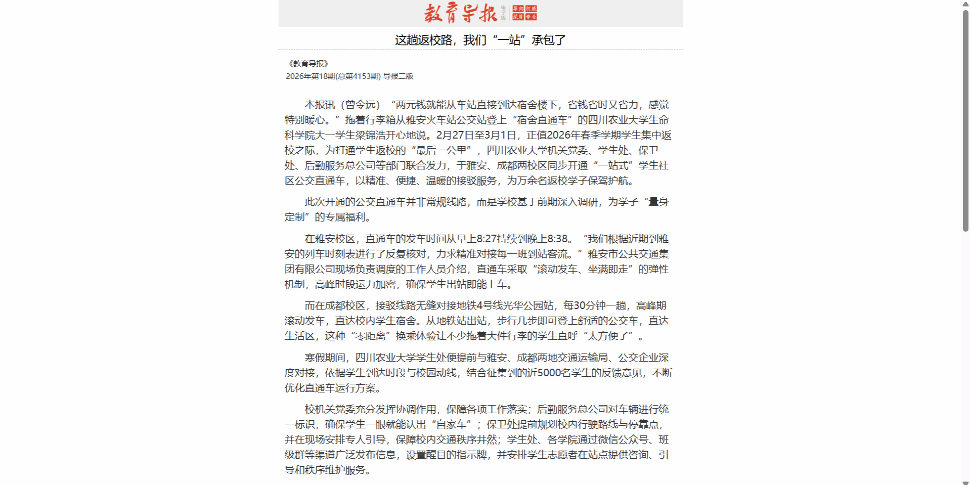 本报讯(曾令远)“两元钱就能从车站直接到达宿舍楼下,省钱省时又省力,感觉特别暖心。”拖着行李箱从雅安火车站公交站登上“宿舍直通车”的四川农业大学生命科学院大一学生梁锦浩开心地说。2月27日至3月1日,正值2026年春季学期学生集中返校之际,为打通学生返校的“最后一公里”,四川农业大学机关党委、学生处、保卫处、后勤服务总公司等部门联合发力,于雅安、成都两校区同步开通“一站式”学生社区公交直通车,以精准、便捷、温暖的接驳服务,为万余名返校学子保驾护航。