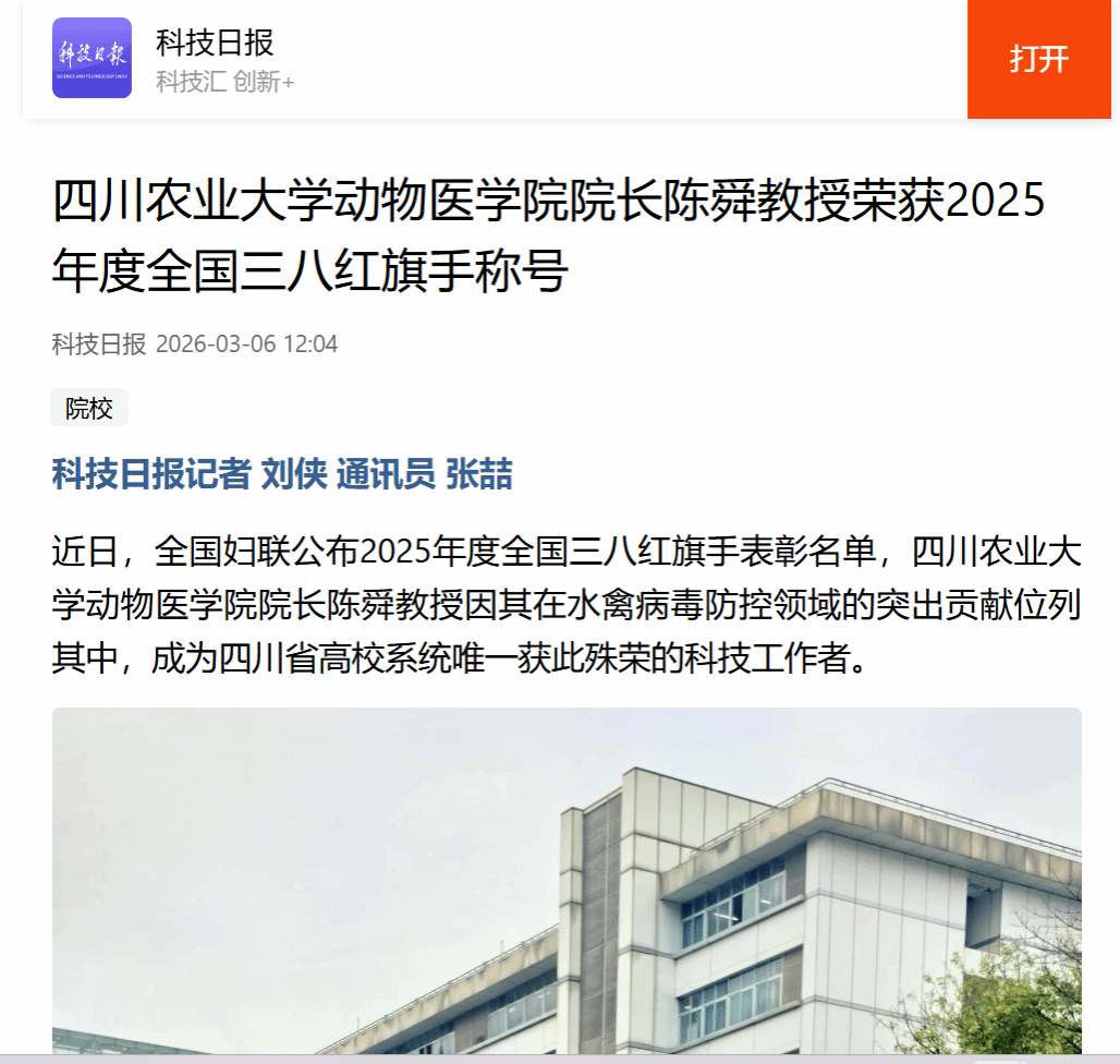 近日,全国妇联公布2025年度全国三八红旗手表彰名单,四川农业大学动物医学院院长陈舜教授因其在水禽病毒防控领域的突出贡献位列其中,成为四川省高校系统唯一获此殊荣的科技工作者。